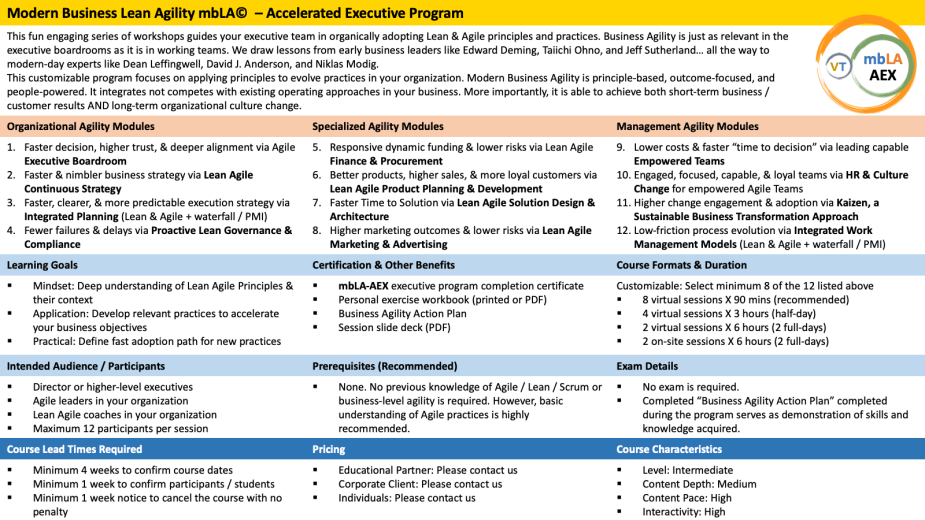 This customizable program focuses on applying principles to evolve practices in your organization. Modern Business Agility is principle-based, outcome-focused, and people-powered. It integrates not competes with existing operating approaches in your business. More importantly, it is able to achieve both short-term business / customer results AND long-term organizational culture change.